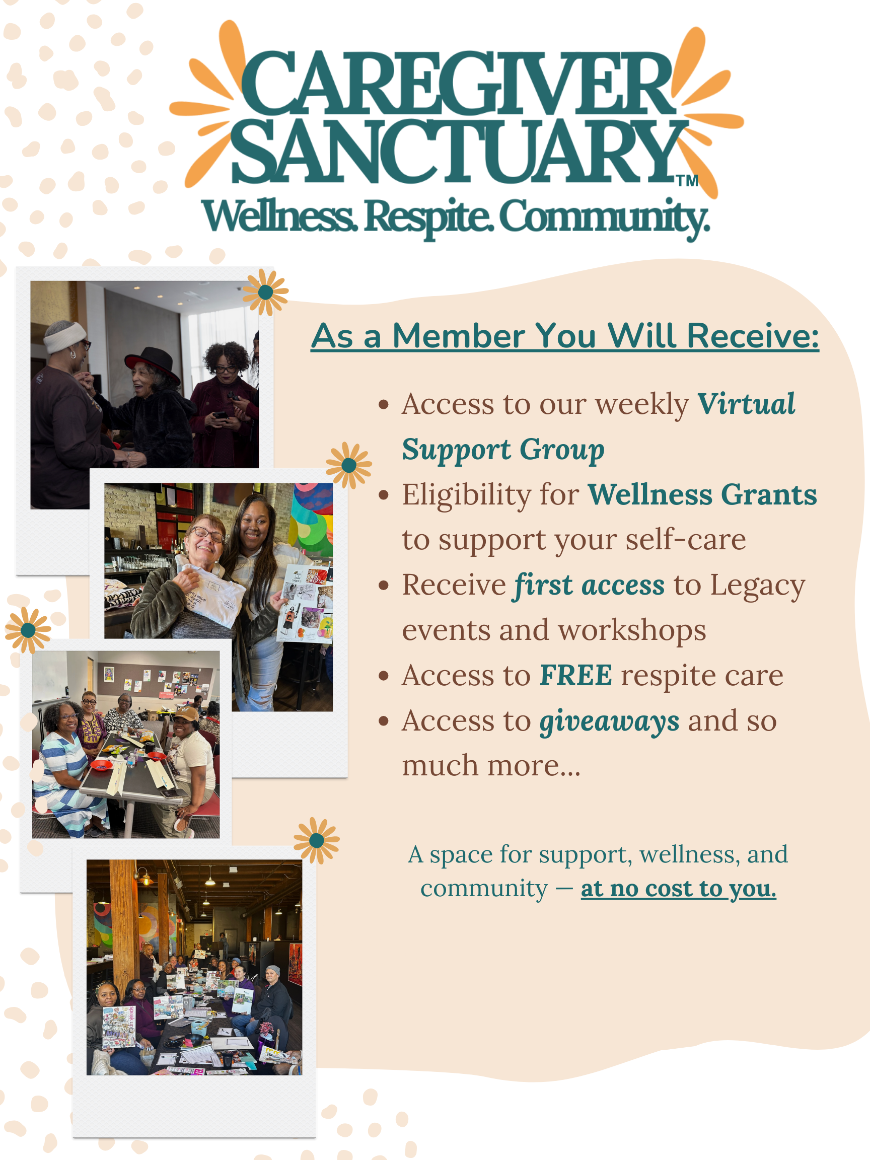 Caregiver Sanctuary members are eligible to apply. Each grant is personalized based on your wellness needs and comes with a small care package to help you feel restored.